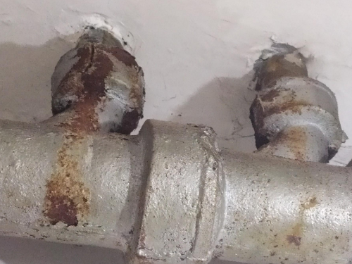 3、先把鑄鐵管拿鑄鐵焊條改成立式朝向下水,接著在后接管件頂端預(yù)置一個(gè)接頭,再把自家下水的PVC管接到接頭里面,把此接頭朝著自家下水的窟窿,之后在鑄鐵接頭內(nèi),PVC管周遭打上防水膩?zhàn)樱詈竽ㄉ戏浪z即可。
